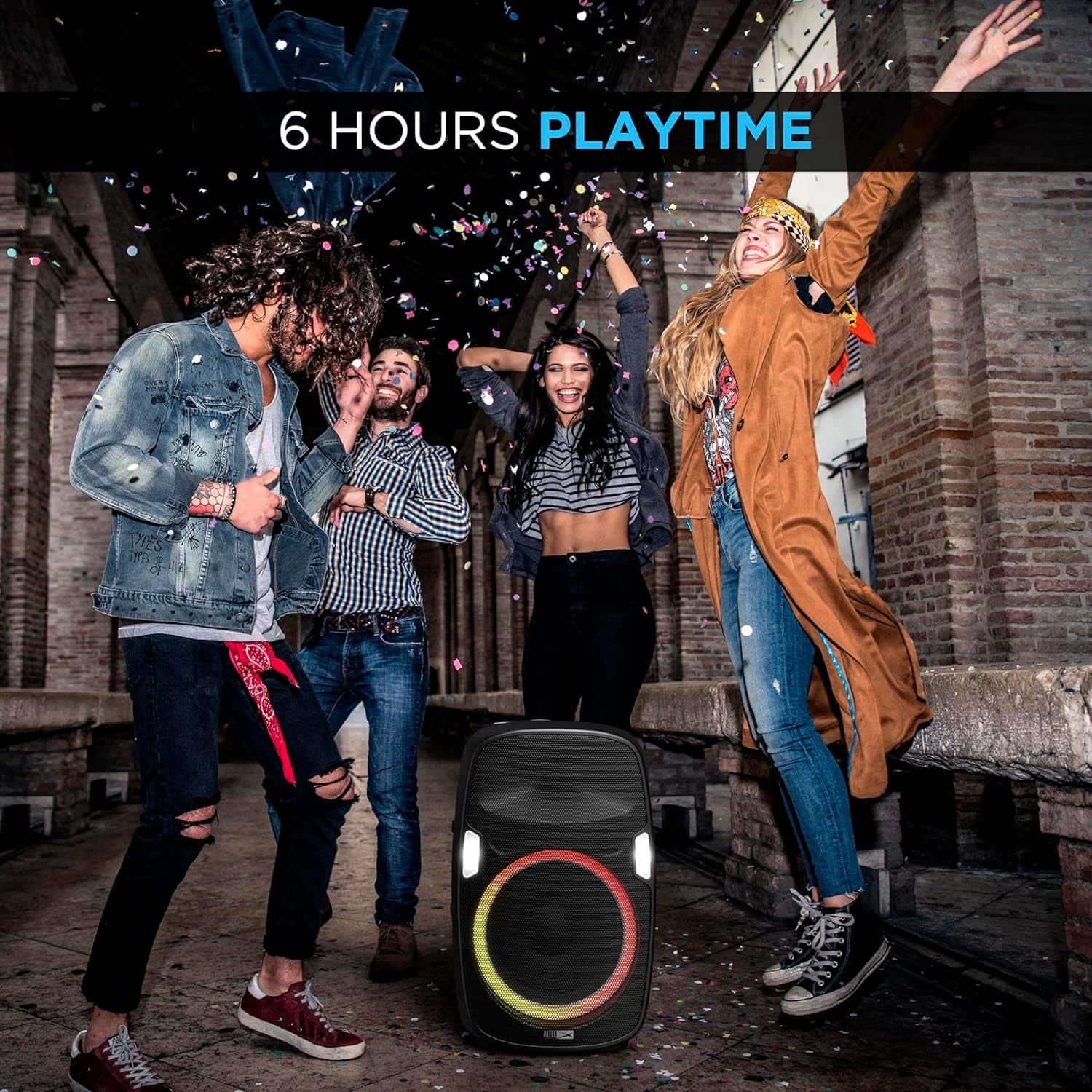 - This trolley Bluetooth speaker with wireless mic features seven LED light modes that allow the built-in LED lights to beat, strobe, and pulse with your music to brighten up the look and feel of any party, festival, wedding, or event you have in mind