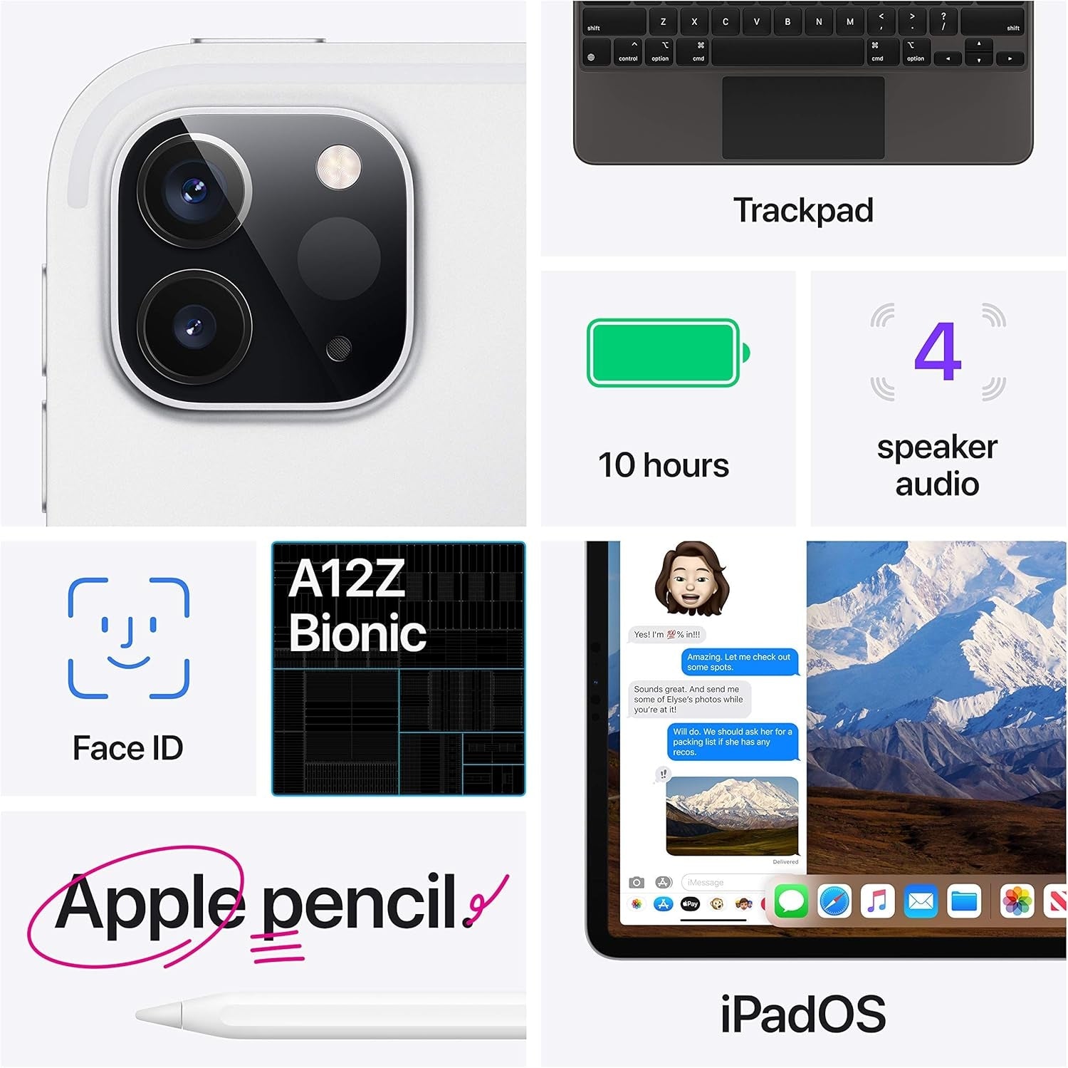 Edge-to-Edge Liquid Retina Display The Liquid Retina display in the iPad Pro features wide color support, True Tone, and an anti-reflective coating for a natural, accurate viewing experience both indoors and out. It also supports ProMotion technology, which automatically adjusts the display's refresh rate, up to 120Hz, for smooth and responsive scrolling. A12Z Bionic Chip The Apple A12Z Bionic chip, built on 7nm technology, is designed to tackle complex tasks such as editing photos, creating 3D models, and more. Additionally, a Neural Engine chip works alongside the A12Z for advanced machine learning from photography to AR. Face ID & Cameras With the removal of the home button, the iPad Pro now utilizes its 7MP front-facing TrueDepth camera with Face ID for security and unlocking your device. It works in any position and enables you to use Apple Pay in apps as well as Animoji and Memoji in chats. At the rear is a 12MP camera, which supports 4K video, document scanning, and AR experiences, as well as a 10MP ultra-wide camera for a different perspective.