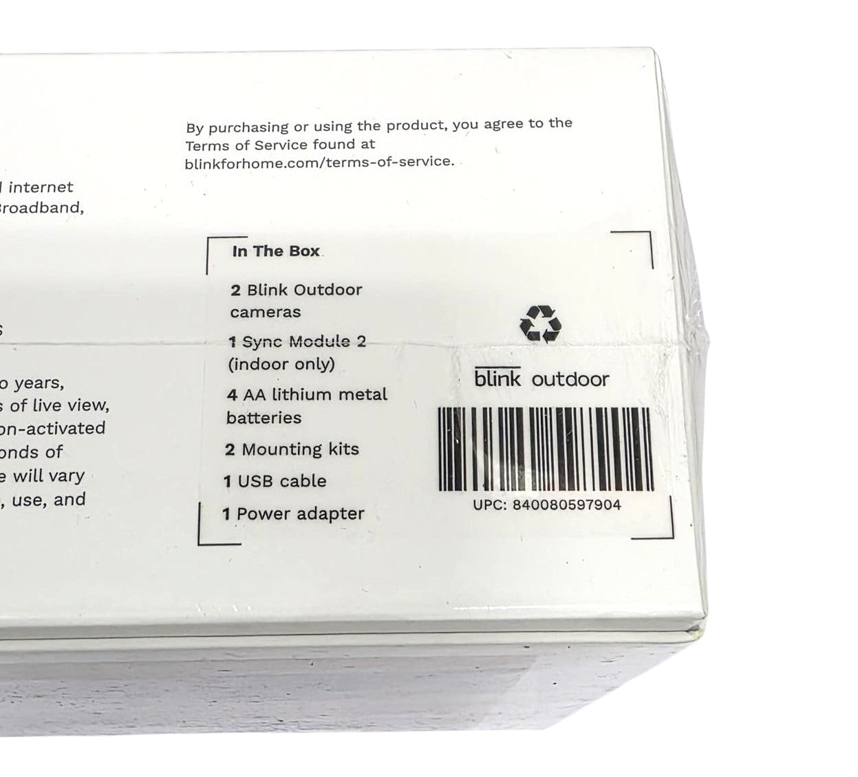 | Includes | 2 Outdoor Cameras, 1 Indoor Pan/Tilt camera, Sync module, Blink Yard sign |