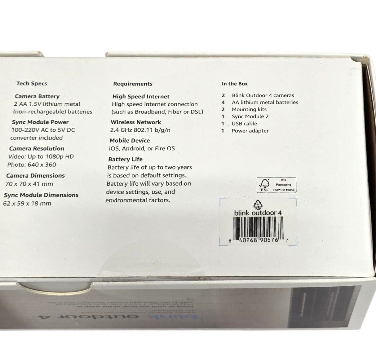 In the box - Includes two Outdoor 4 cameras, one Sync Module 2 kit, four AA lithium metal batteries, two mounting kits, one USB cable, and one power adapter.