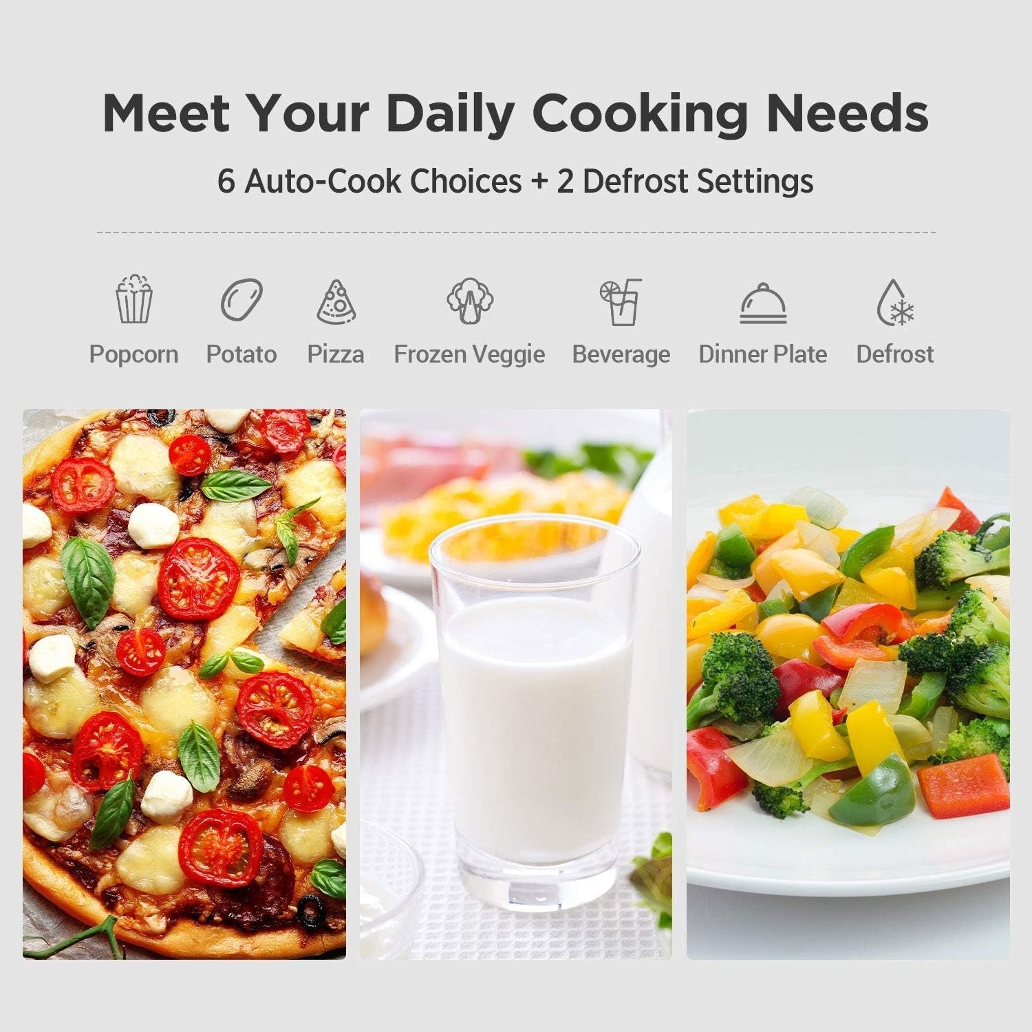 - One touch cooking for six common foods easily make popcorn, potato, pizza, frozen vegetables, or reheat a beverage or dinner plate