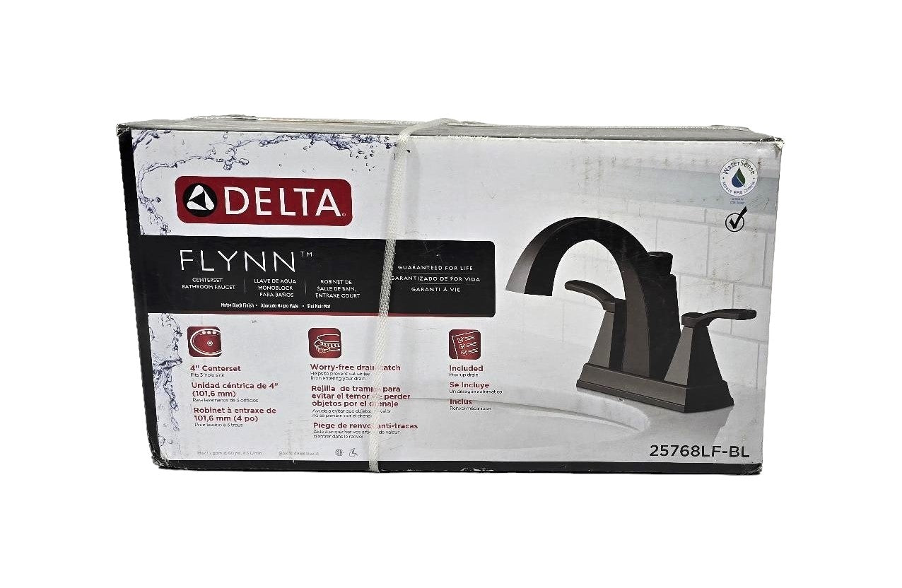 This Delta Flynn Matte Black 25768LF-BL 2-Handle 4-in Centerset WaterSense Bathroom Sink Faucet with Drain is in New condition.