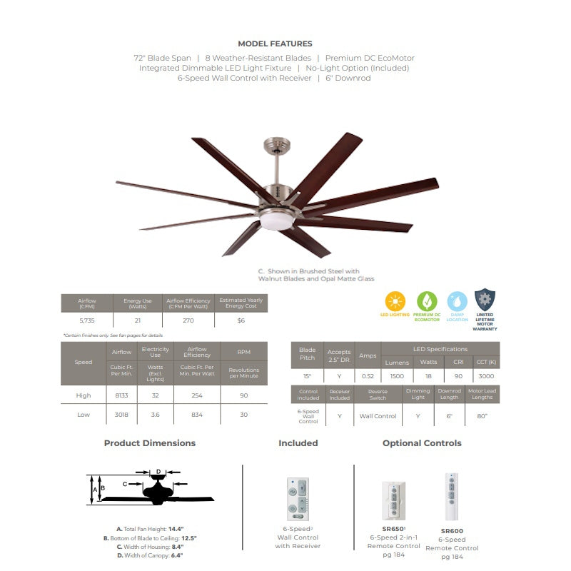 LARGE CEILING FAN WITH QUIET DC MOTOR – This big ceiling fan delivers superior airflow with its 72-inch blade span, 15-degree blade pitch, and state-of-the-art EcoMotor that runs more quietly, efficiently, and cooler than standard ceiling fans