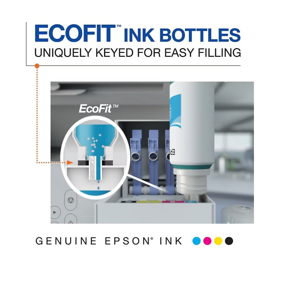 Epson’s EcoTank replacement ink bottles deliver thousands of pages. Plus, genuine Epson quality. Save up to 80% with low-cost replacement ink bottles vs. ink cartridges. Get thousands of pages. Save up to 80% with low-cost replacement ink bottles vs. ink cartridges. EcoFit ink bottles are uniquely keyed for easy filling. Ultra high-capacity ink bottles. Genuine Epson Ink gives you reliable performance and brilliant results. Plus, exclusive, uniquely keyed EcoFit bottles make it easy to fill each color tank.