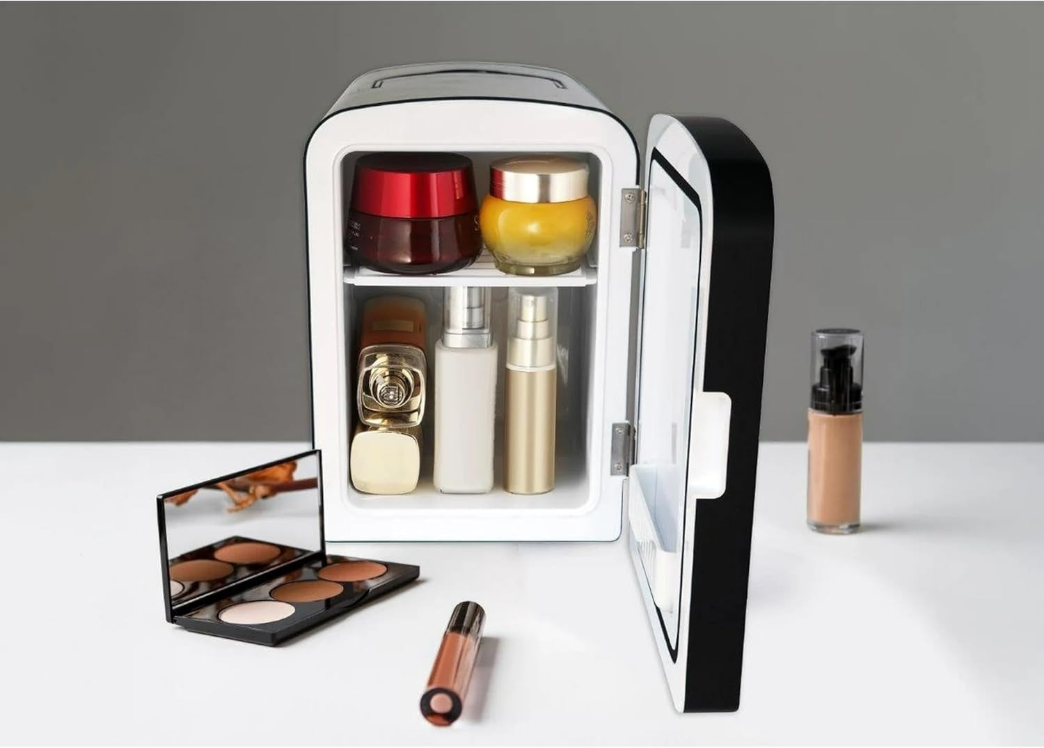 Keep snacks fresh and makeup cold with this retro-design cooler-mini fridge. It has room for your snacks, and chilled beverages for convenience while working or studying long days. It's designed to easily fit on your desk, bookshelf or other small space. This fridge holds 50% more cans then previous model. This compact mini beverage/beauty refrigerator is the ideal place to store your skincare products. Great for moisturizers, masks, serums and creams and more.