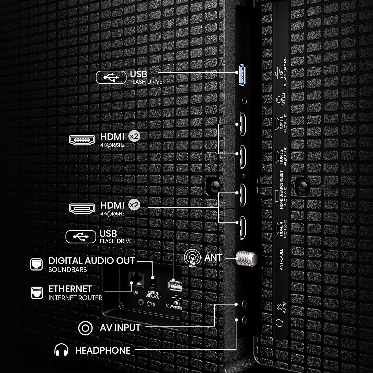 Connect more and play more with four full HDMI 2.1 ports—supporting high bandwidth, ultra-smooth 4K 165Hz gaming, and seamless switching between next-gen consoles and premium devices.