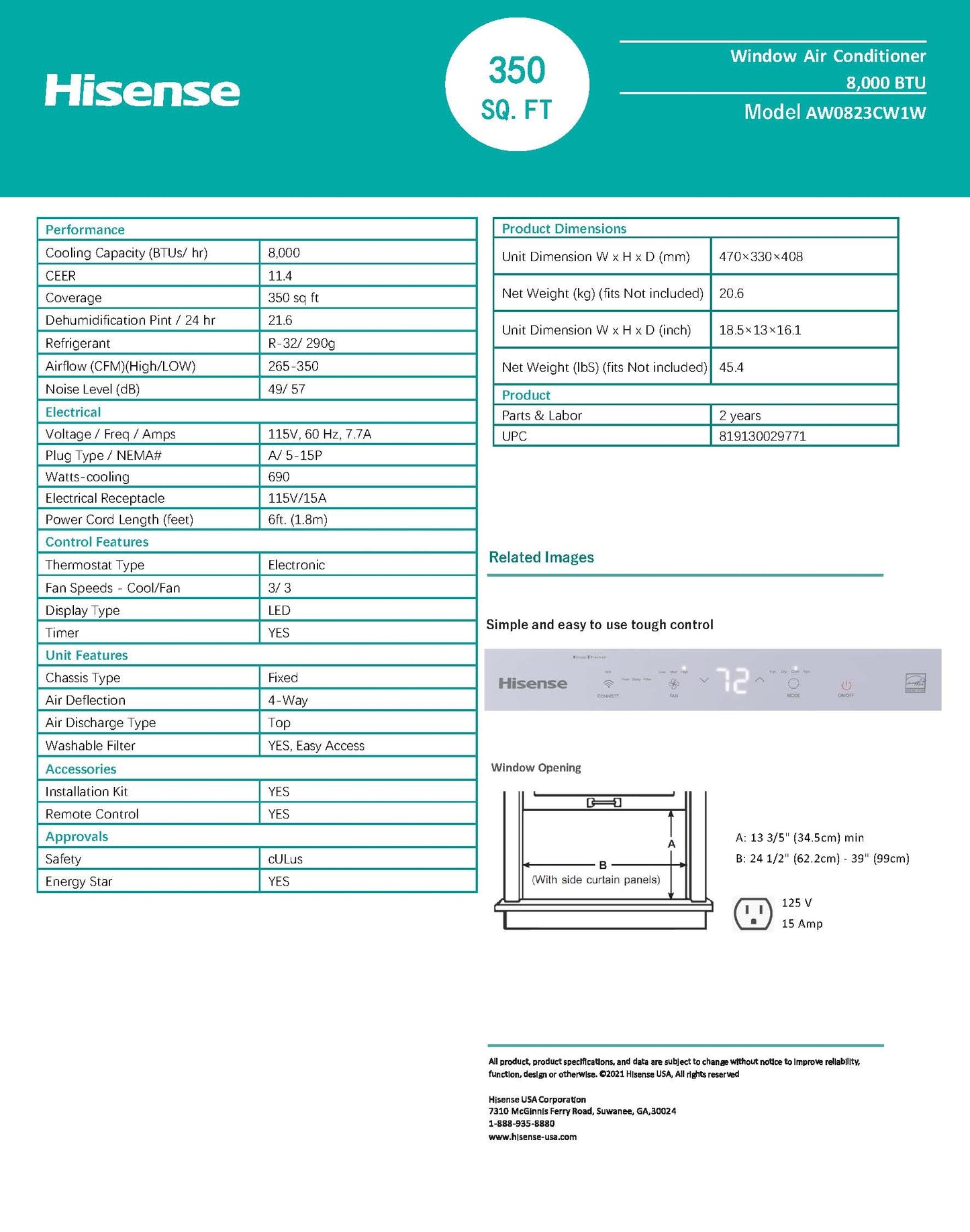 - Hisense 350-sq ft Window Air Conditioner 115v,
