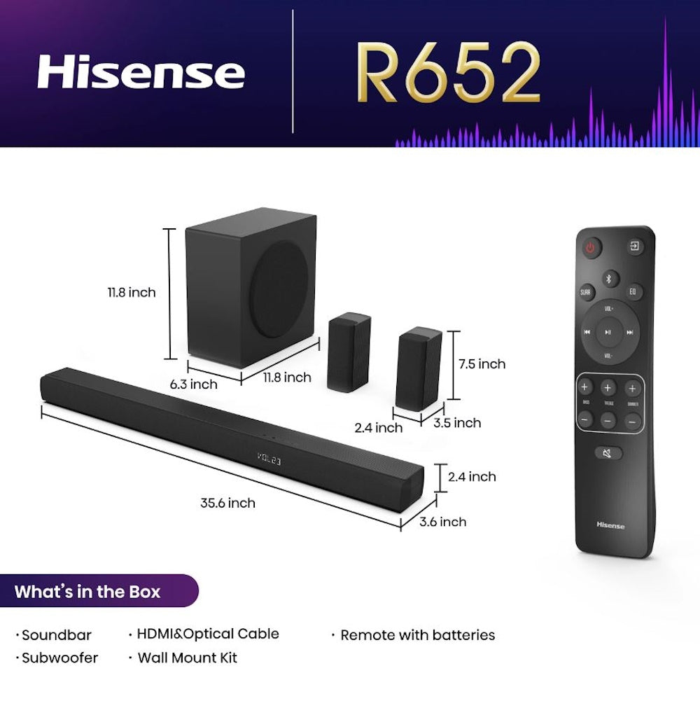 Hisense 5.1 Ch Soundbar R652 with a total of 440W output, Rear Surround Speakers, 6.5” Wireless Subwoofer, HDMI eARC, Dolby Atmos and DTS Virtual X, Easy Connect