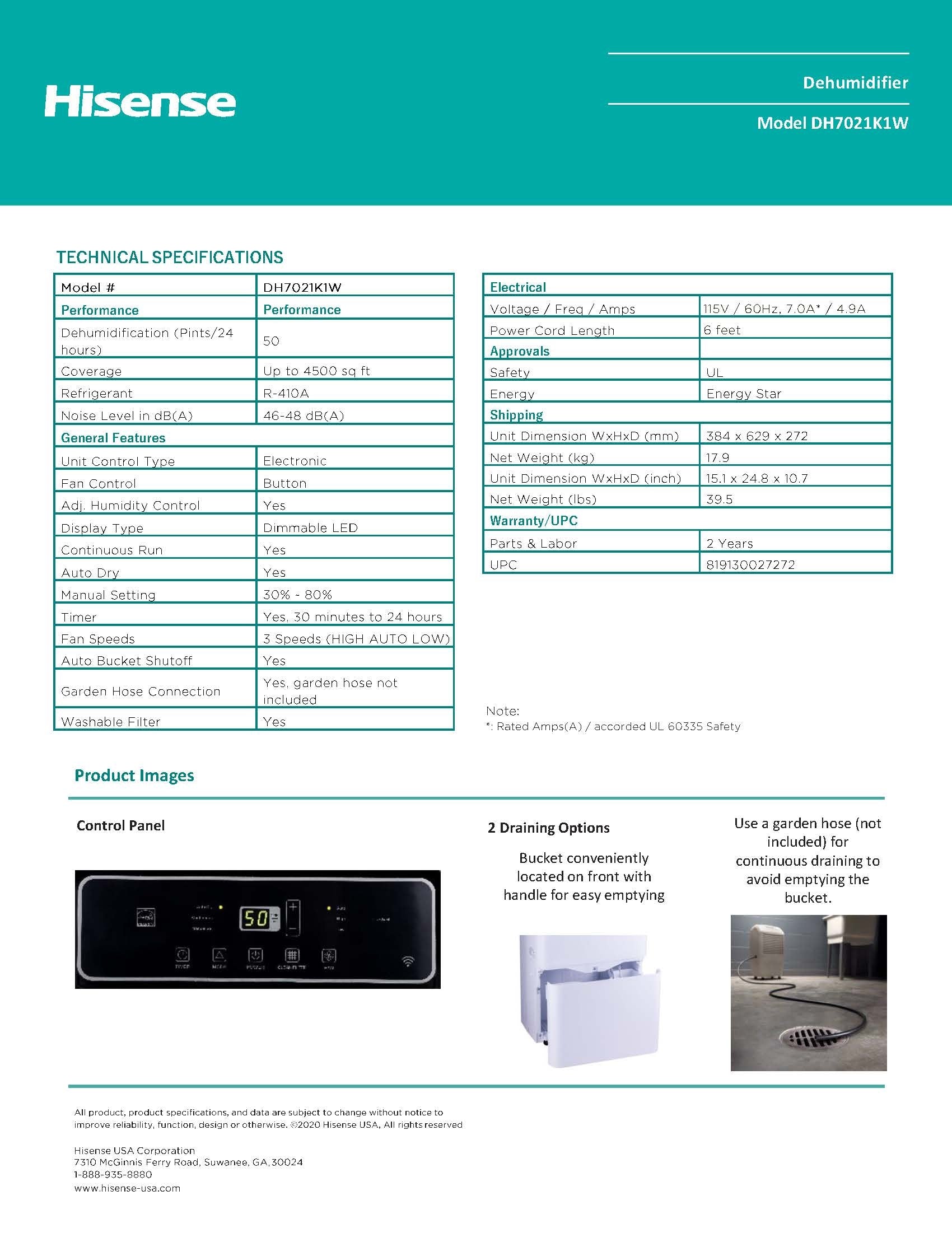 The Hisense DH7021K1W Energy Star 50 Pint 3-Speeds Dehumidifier quietly collects water into the slide out internal bucket or can discharge the water via connecting a garden hose (not included) through the side of the cabinet. Reliable and eco-friendly, this dehumidifier can operate at temperatures as low as 38°F. Three operating modes (manual, continuous, and auto dry) and the very low sound level make this a versatile choice. Additional features include a programmable 24-hour on/off timer, adjustable humidistat, and full-tank alert/shutoff.