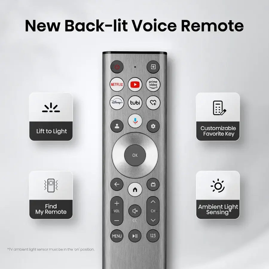 The Backlit Voice Remote offers convenience with Lift to Light for illuminated keys, a Customized Favorite Key for quick app access, and Find My Remote to help you never lose it. Ambient Light Sensing adjusts the backlight based on your TV’s light sensor. Effortless control, day or night.