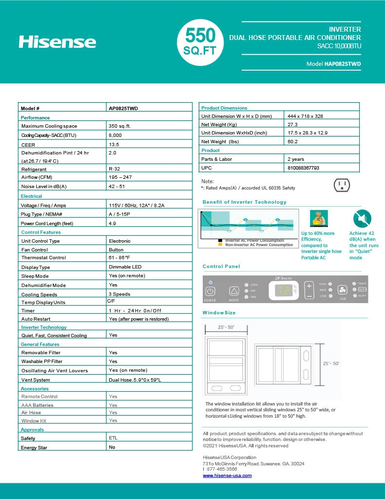 Hisense 8,000 BTU DOE/SACC (10,000 ASHRAE) 350 Sq Ft Dual Hose Portable Air Conditioner with Inverter and Wi-Fi HAP0825TWD Specifications: