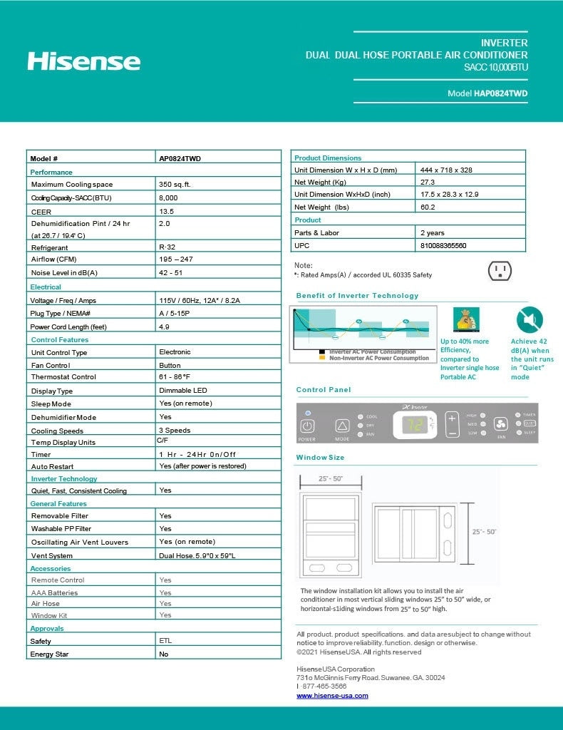 The Hisense 8000 BTU Portable Air Conditioner provides Fast Cooling with its Dual Hose design, by eliminating the vacuum effect of standard portable air conditioners. The Inverter technology delivers quiet, efficient, and consistent cooling. The easy-to-install snap-together window kit fits windows 25" to 50" wide, helping preserve the external appearance of your home. The ConnectLife app and included remote control put easy operation right at your fingertips.