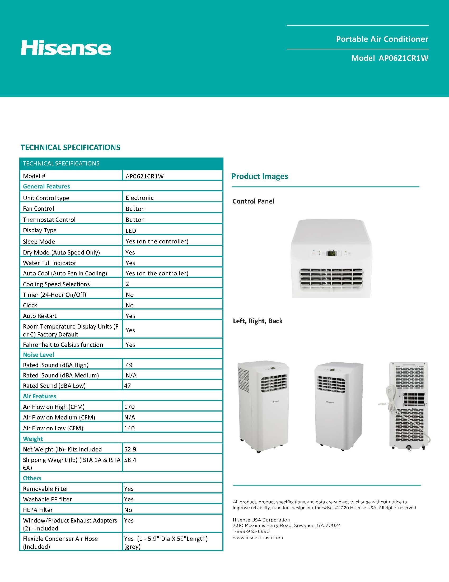 The Hisense AP0621CR1W Ultra-Slim Portable Air Conditioner can be placed in smaller rooms and is easy to install with the included snap-assembly window kit, for windows 18” to 50” wide. Airflow is strong and quiet, with a noise level of only 49 DB. This Hisense portable air conditioner cools, dehumidifies, also functions in fan mode. Your portable AC will be up and running in minutes with the easy-to-install snap-assembly window kit for windows 18" to 50" wide. Condensed water will evaporate outside through the air exhaust hose. Convenient to Operate, included remote to power on and off the AC. After powering on, the multi-directional auto louvre adjusts airflow to a certain angle for your convenience. Smooth-rolling Wheels. Simply move it from room to room. Low-noise cooling system. 3-in-1 Operation This model can operate in three modes (cool, dehumidify and fan) to fit your needs.