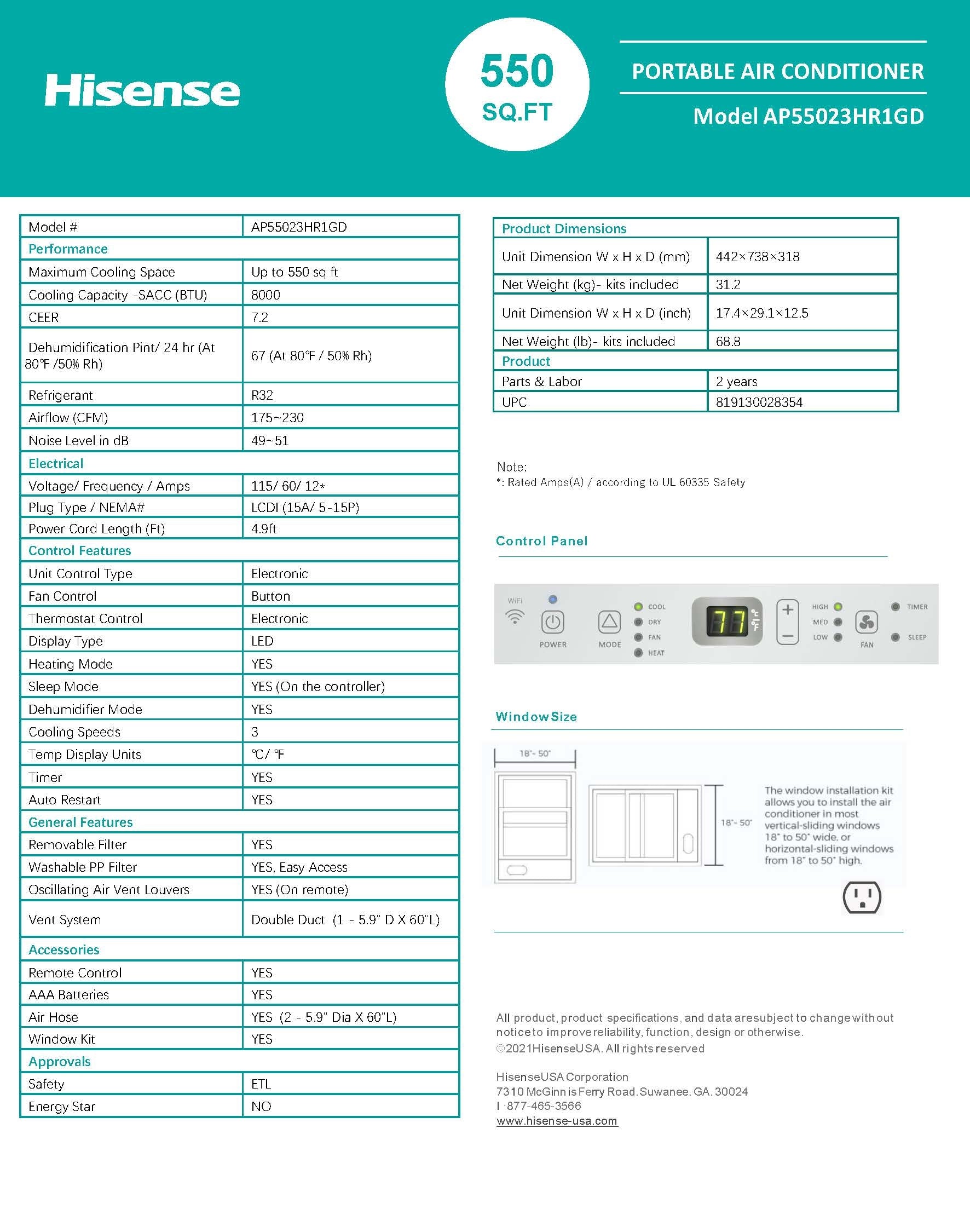 Hisense Smart SACC 8,000 BTU Dual Hose Portable Air Conditioner with Heat Pump AP55023HR1GD Specifications: