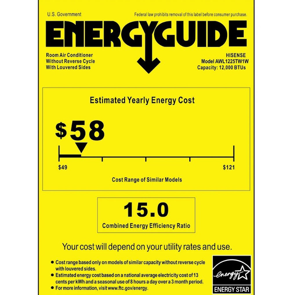 Hisense UltraSlim 12,000 BTU Smart Inverter Window Air Conditioner, Energy Star AWL1225TW1W Specifications: