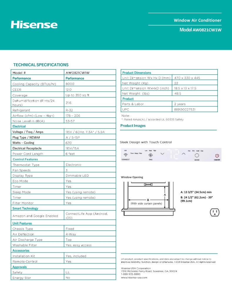 Description: The Hisense AW0821CW1W Smart Window Air Conditioner conveniently keeps you comfortable and can be controlled from anywhere you are. With the free ConnectLife App (Android, iOS), the temperature in your room will always be in control. Featuring a built-in programmable thermostat which can help you save money, changing your setting is just a click away with the cloud-based ConnectLife. Easy to install with the included window kit for windows 24.5 – 39 inches wide.