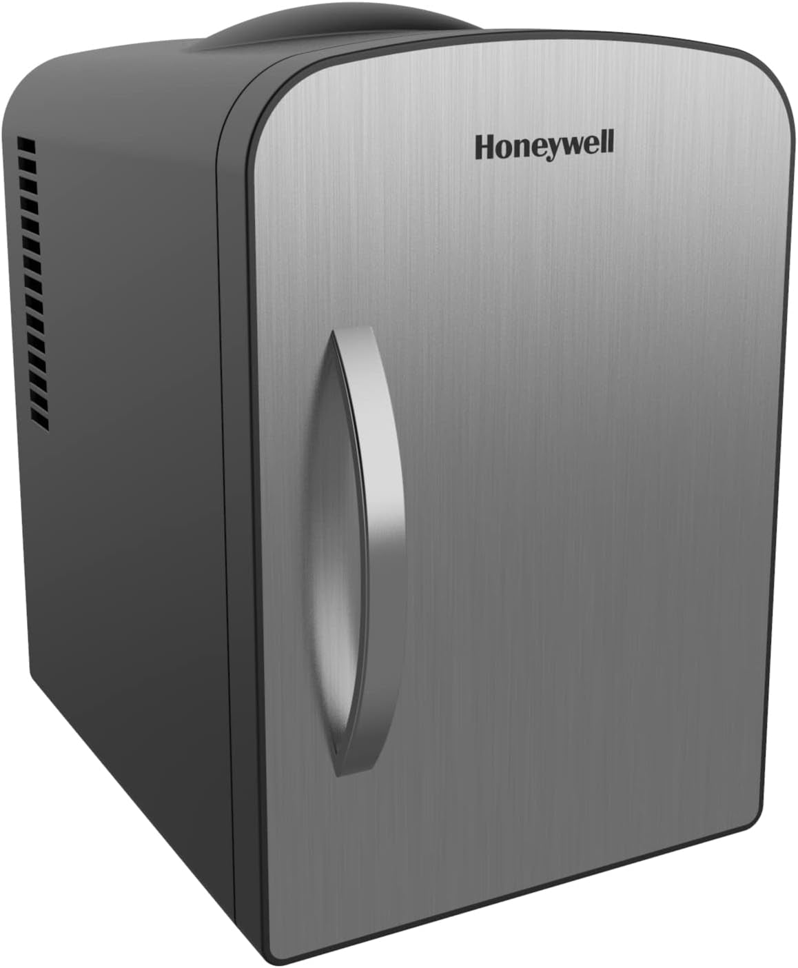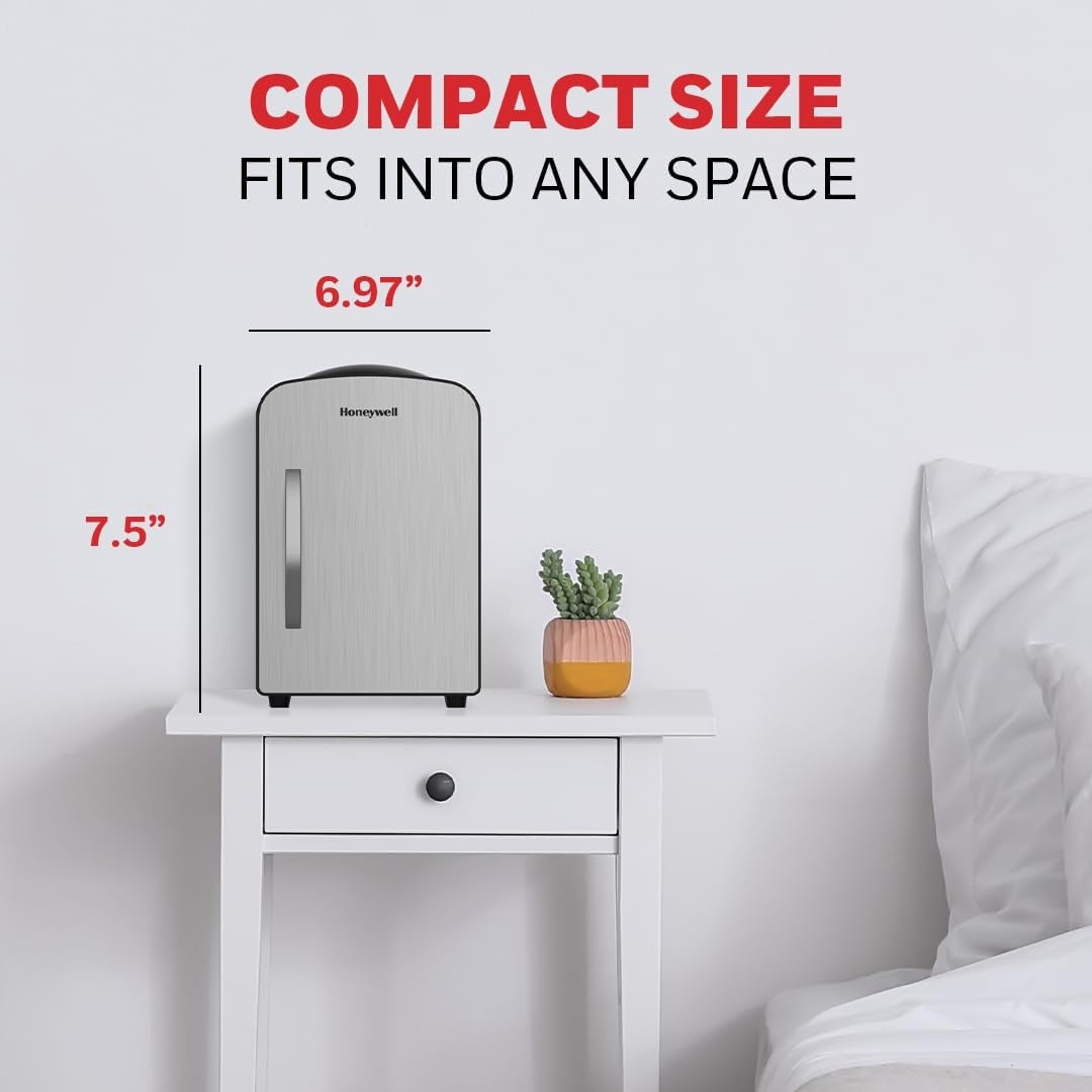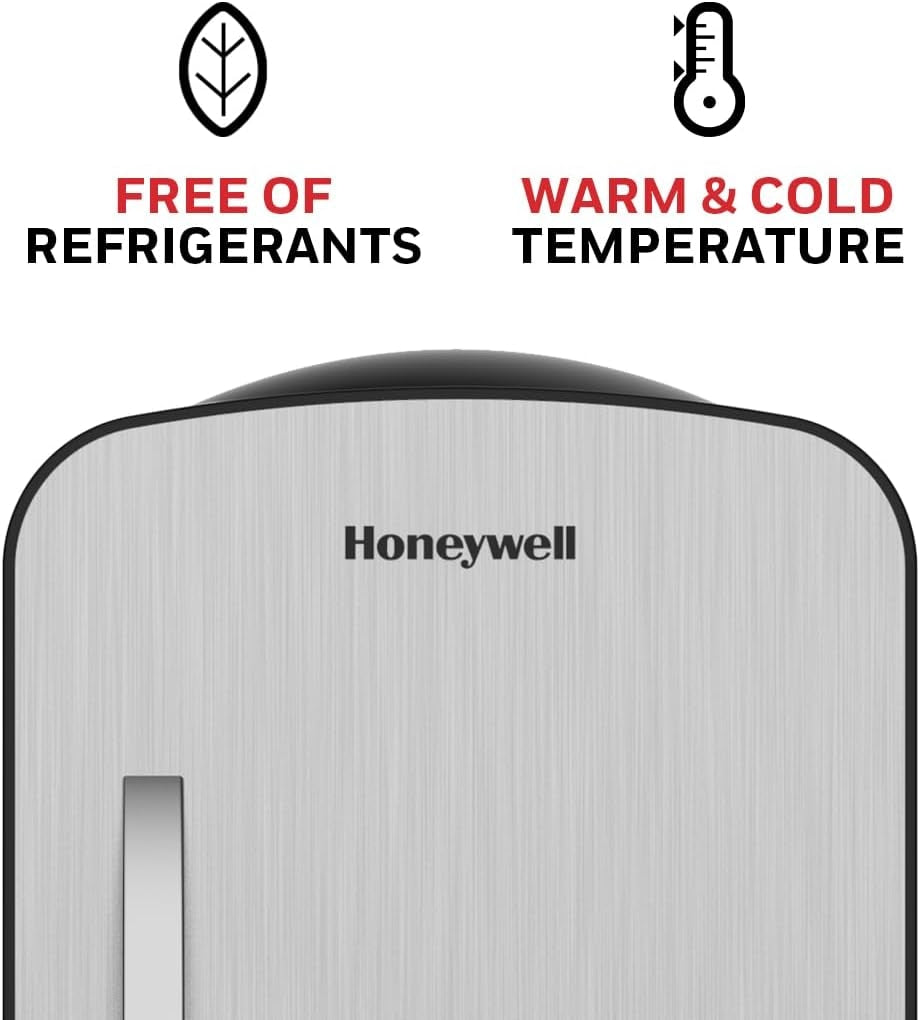 Honeywell 4 Liter Personal Mini Fridge Cooler and Warmer, Fits Six 12oz Cans, Stainless Steel - H4MFSS Description: