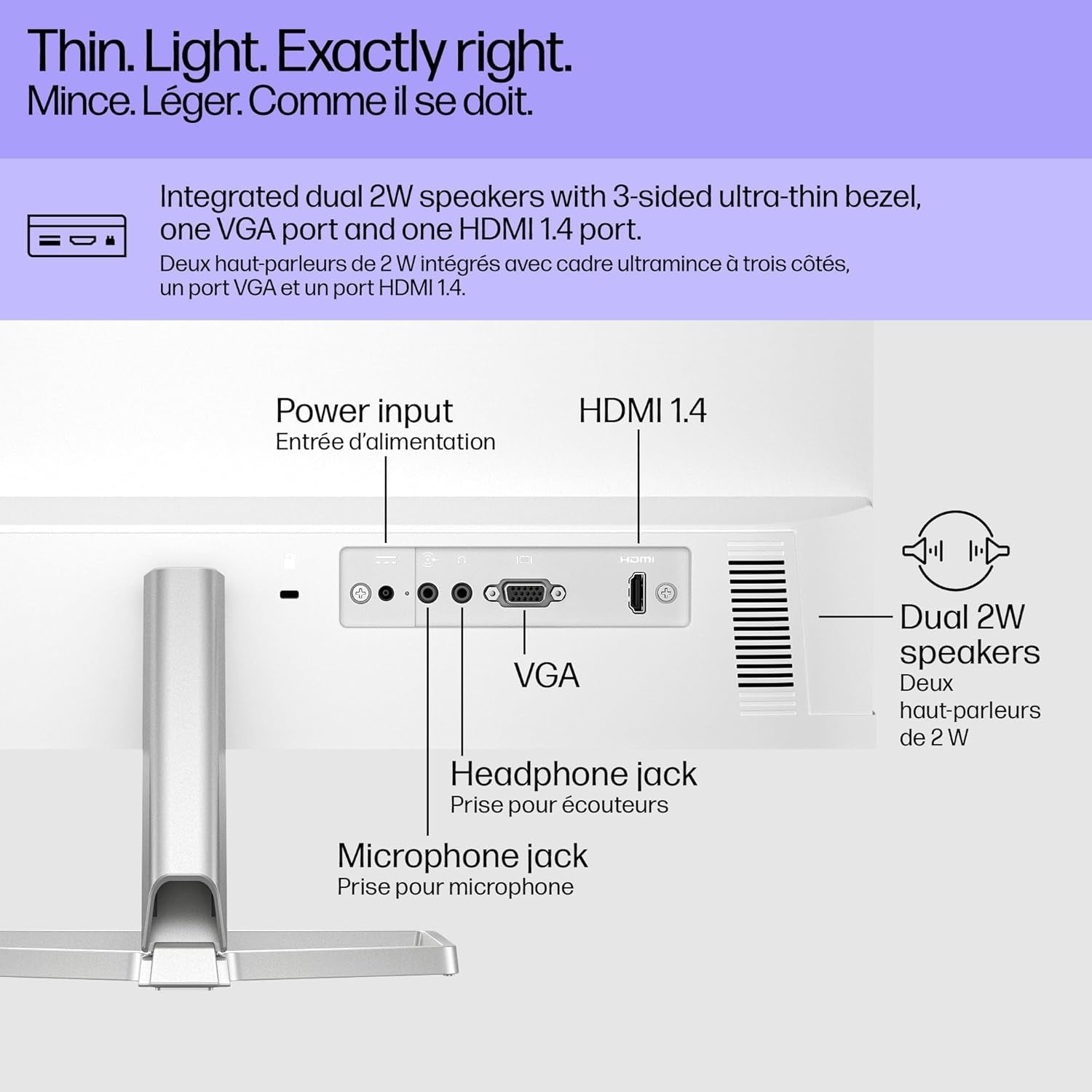 This thin-and-light 23.8" FHD monitor is designed to look great in any space. Whether learning, playing, or watching content, enjoy crisp audio with integrated dual 2W speakers. Its ultra-thin 3-sided borderless design lets you create a seamless dual-screen setup for enhanced viewing. Plus, have more options to connect with HDMI 1.4 and VGA ports.