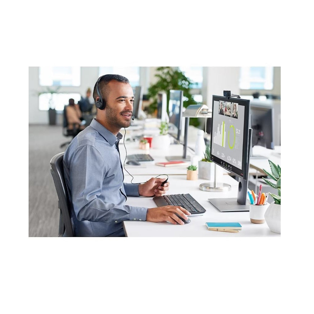 The headset features a USB-A connector that plugs right into your computer. Simple in-line controls on the headset cord let you adjust the volume or mute calls without disruption. The perfect business headset for voice calls, Skype, webinars, and more. The 240cm cable is just the right length to give you the freedom to stand up and stretch during long conversations. Enjoy enhanced digital audio for your favorite music and games and crisp clear calls. A left-sided bi-directional mic can be conveniently positioned for better voice capture and background noise reduction. The headset features a USB-A connector that plugs right into your computer. Simple in-line controls on the headset cord let you adjust the volume or mute calls without disruption. A lightweight headband with swivel-mounted foam ear cushions provides hours of audio comfort. Compatible with Windows, macOS, or ChromeOS, and popular calling platforms. Headset frequency response 100Hz - 10kHz.