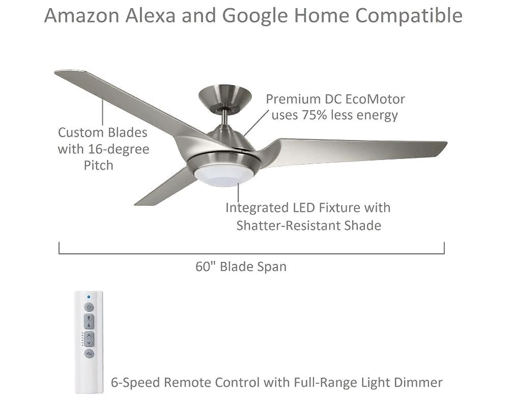 Luminance Kathy Ireland Home Sweep Eco WiFi Smart Ceiling Fan, 60 Inch, Brushed Steel Specifications: