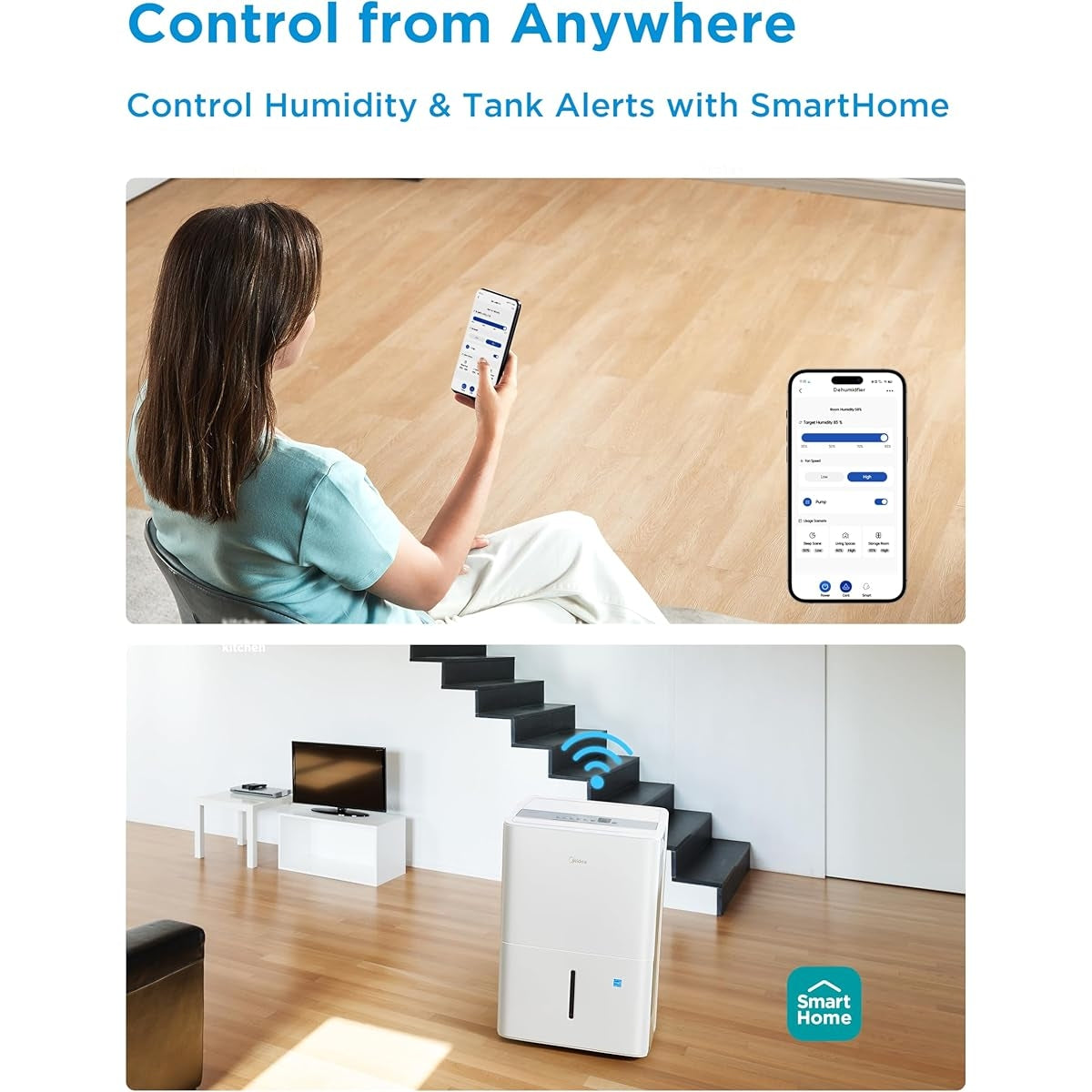 - SMART CONTROL: This dehumidifier is Wi-Fi enabled and can be controlled from anywhere through the cloud using the SmartHome app on iOS or Android. You can also use voice commands throughout your house, office, or apartment using Alexa or Google Assistant.