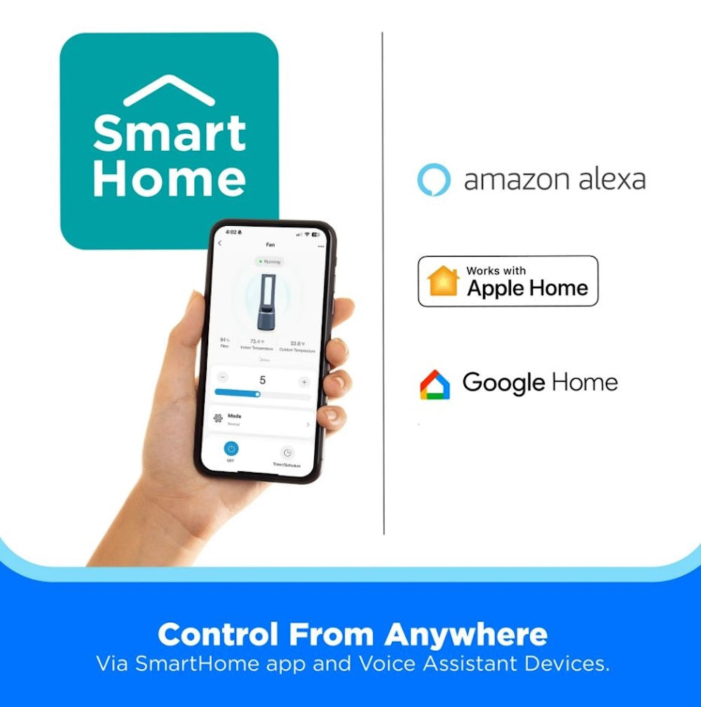 Experience ultimate comfort and convenience with the Midea Bladeless Tower Fan & Air Purifier. This tower fan is equipped with a powerful motor that runs quietly, especially on the first five of its ten speed settings. With up to 25 feet of coverage and 60° oscillation, this fan is perfect for cooling large areas. Additionally, it combines advanced plasma ion technology with HEPA air filters that meet strict California standards. This Matter Certified fan is compatible with app and voice controls, allowing you to manage its settings from anywhere. Give your home a cool, quiet, and clean atmosphere with the Midea Blade Tower Fan & Air Purifier.