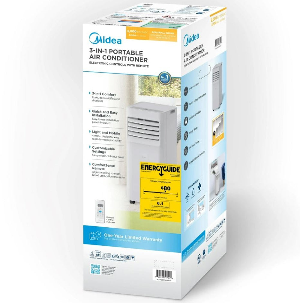 Midea 5,000 BTU Portable Air Conditioner with ComfortSense Cools up to 150 sq. ft. MAP05R1AWWT-T Description:
