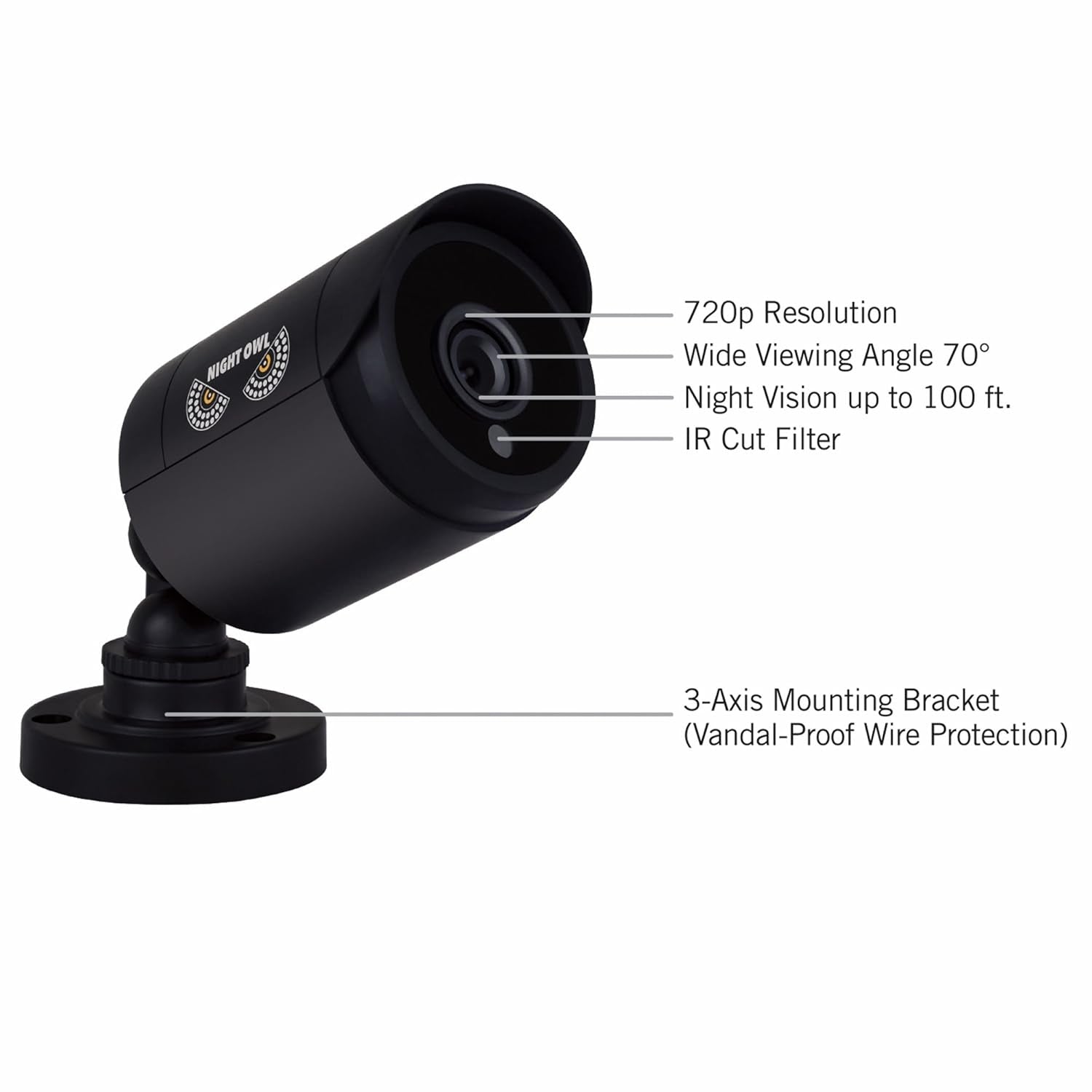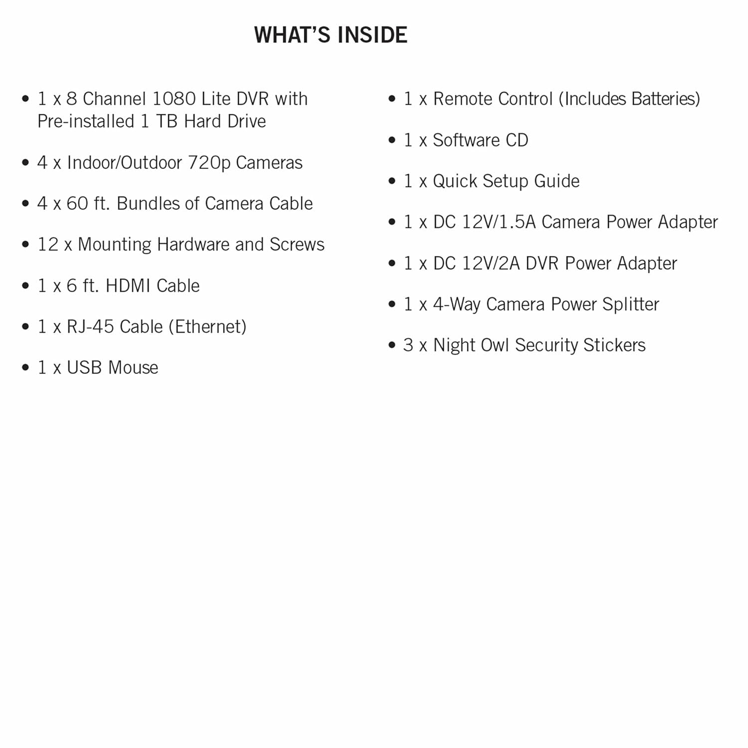- Includes 8-channel DVR with pre-installed 1TB hard drive, 4 indoor/outdoor 720p wired cameras, four 60' bundles of camera cable, mounting hardware and screws, 6' HDMI cable, RJ-45 cable (Ethernet), USB mouse, remote control (includes batteries), software CD, quick setup guide, DC 12V/1.5A camera power adapter, DC 12V/2A DVR power adapter, 4-way camera power splitter and Night Owl security stickers