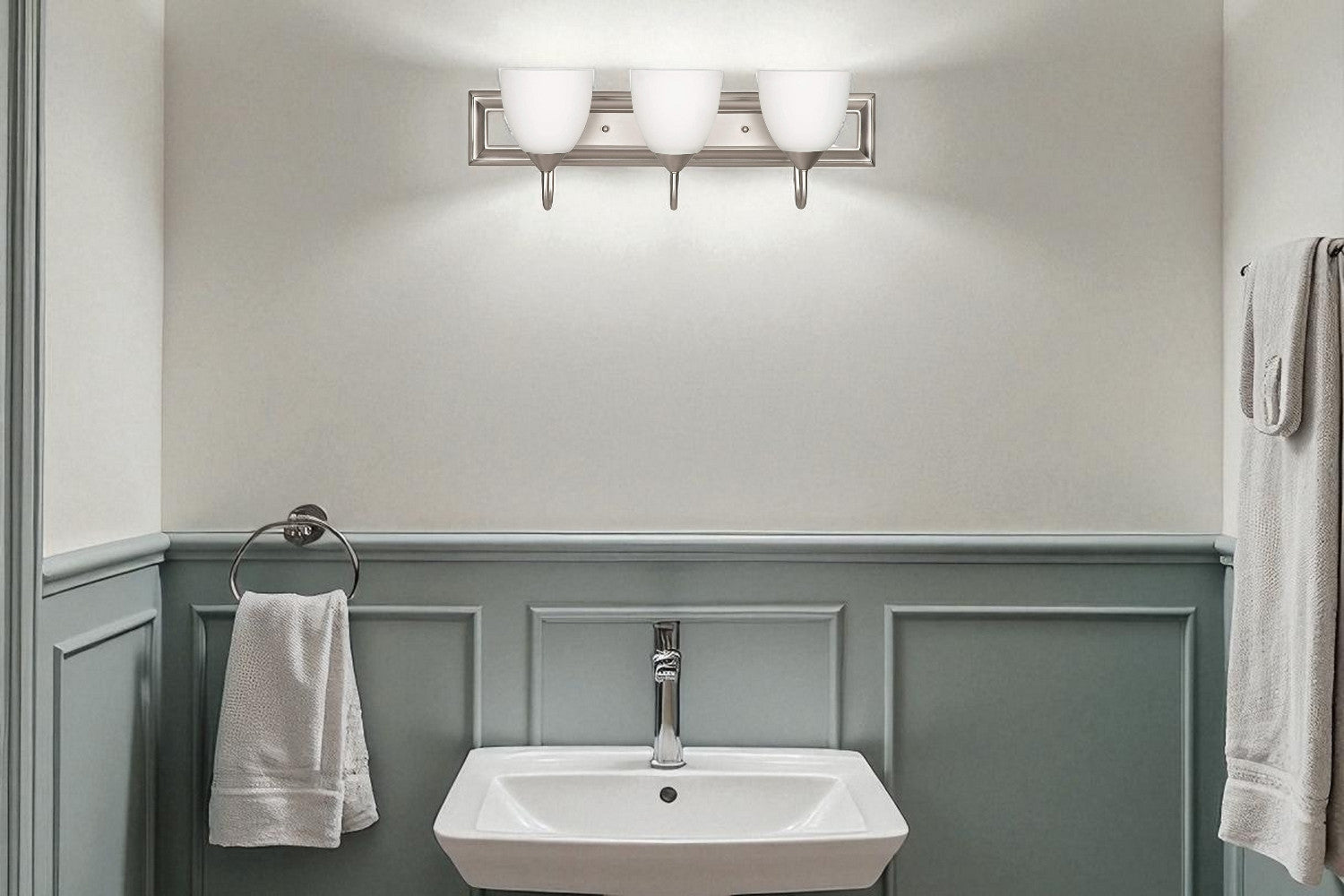 - QUALITY BUILD WITH CONTEMPORARY FEEL – Vanity light bar is constructed from durable iron in a neutral satin nickel finish. Paired with three round milk glass shades for natural light diffusion.
