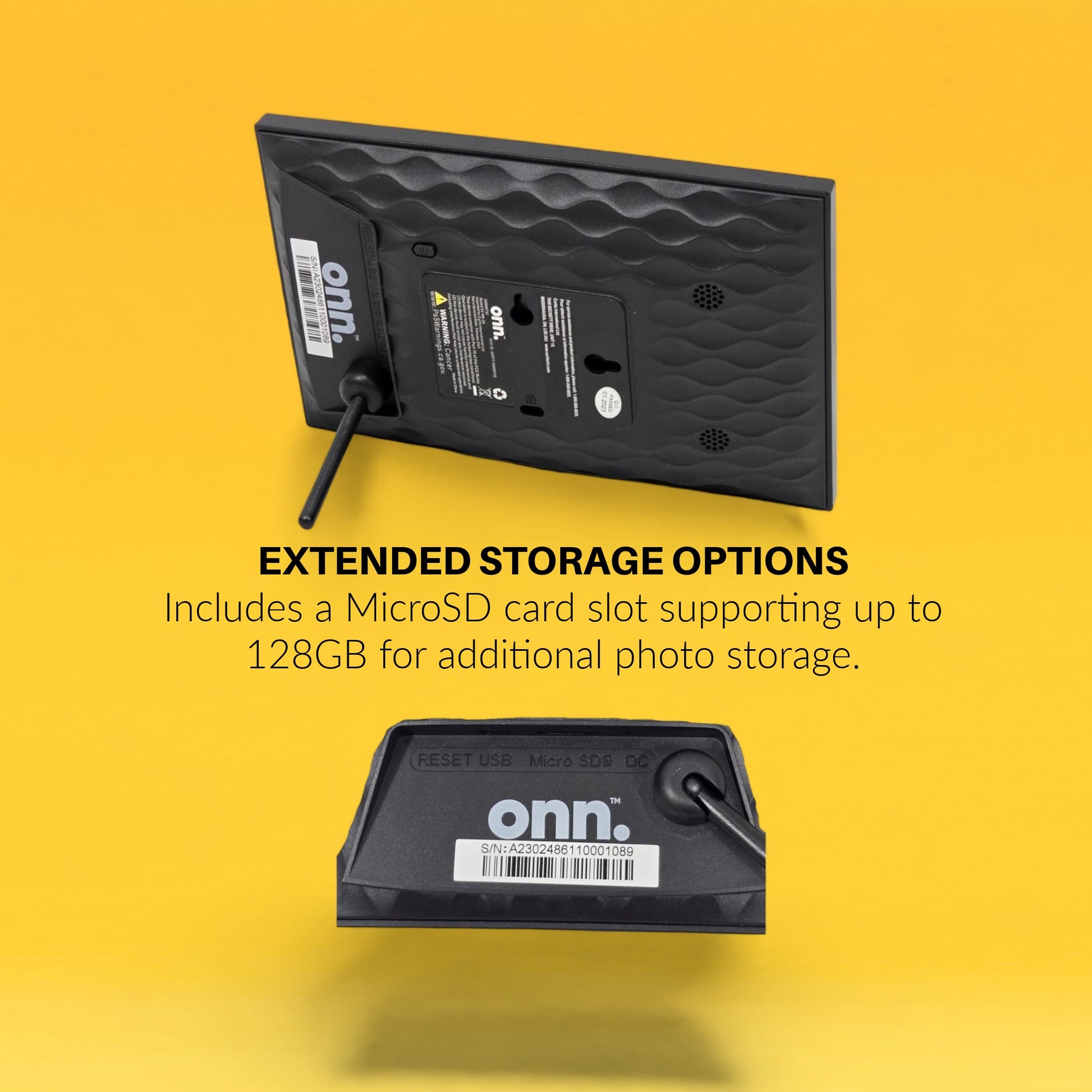 Receive wonderful photos and videos from friends and family with the ONN 7-inch Black Smart Wi-Fi Picture Frame with built-in Frameo software. Use the free Frameo app (iOS & Android) to send photos and videos with a short caption directly from your smartphone to the ONN Smart Wi-Fi Picture Frame - wherever you are in the world. The photos appear on the frame within seconds, so you can enjoy the moments as they happen. The frame features a colorful and high resolution 7” touchscreen that makes it a joy to see all your photos and is easy for everyone to use. With 16GB of internal memory you can store up to 20,000 photos. You can even display photos directly from your micro SD card without taking up space on the frame. The ONN Smart Wi-Fi Picture Frame makes the perfect gift across generations - it’s an easy way to stay connected with your loved ones even when you are miles apart.