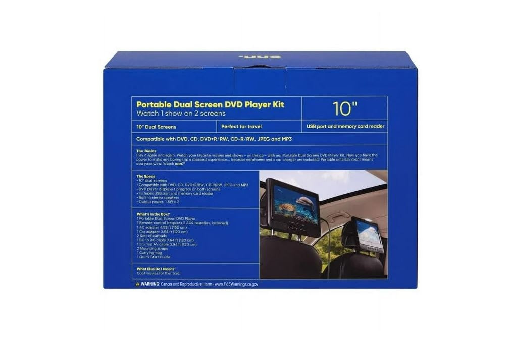 Do more than take your movies on the road—share them! With this dual-screen portable DVD player, you can maximize entertainment between two LCD screens. No one will miss any details with the 1024 x 600 native resolution display. Use the convenient headrest mounting straps to make every car ride a breeze. This onn. 10" Dual Screen DVD player includes: a remote control, which requires 2 AAA batteries(included), a 3.5mm audio/video cable, a DC to DC connection cable, two set of earbuds, an AC/DC power adapter, 12V DC car adapter, 2 headrest straps, a carry case with 3 organizing compartments, a Quick Start Guide and a complete User's Guide.