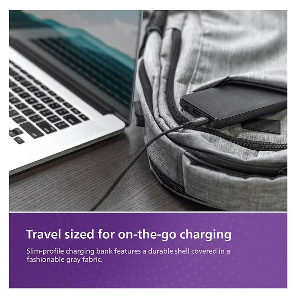 - Each slim-profile charging bank features a durable shell covered in a fashionable gray fabric exterior