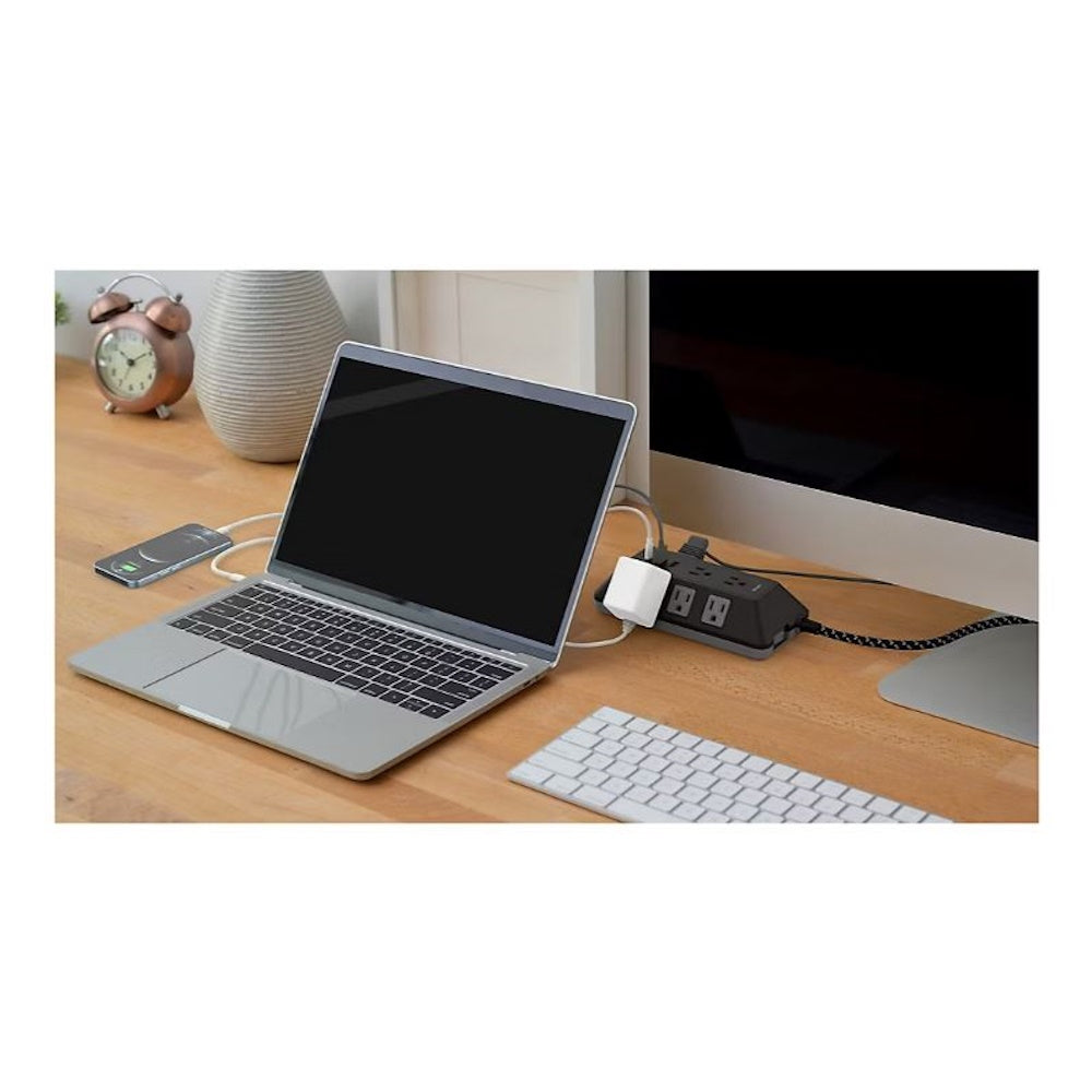 - Surge protector features adapter-spaced outlets, two USB-A ports and one USB-C port (20W)