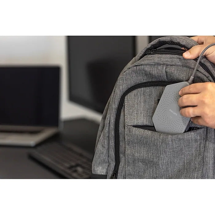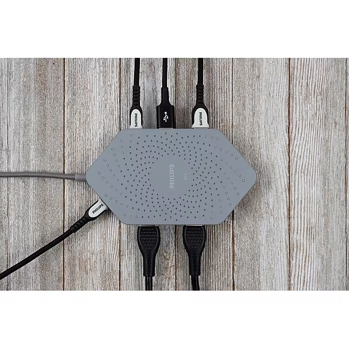 Boost your productivity with the convenience and charging capability of the Philips Elite Plus USB Type-C docking station with Qi charging. This compact docking station improves the productivity and versatility of your USB Type-C devices with one easy connection. Simply plug it into your device's USB Type-C port and connect to vital accessories such as a keyboard, mouse, external hard drives, USB flash drives, HDMI displays, and more. And, when you need to charge your Qi-enabled smartphone or tablet, simply center it on top of the docking station for 10W of fast charging. The unit's flat surface with rubberized design ensures your device will sit securely in place. The docking station's compact, durable design easily fits into a laptop case, briefcase, or backpack, and is great for travel or use in your home, office, or dorm room. This handy docking station includes a USB Type-C port that provides the perfect charge for devices requiring up to 100W, such as laptops, smartphones, and tablets. This ensures your device is actively charging while in use. Simply plug your device's power adapter into a wall outlet and the docking station's USB Type-C laptop charging port. This docking station also includes a second USB Type-C port for fast data transfer. Two side-by-side HDMI ports support resolutions up to 4K at 30Hz, allowing you to mirror content on your TV or add a screen to your workstation setup. Dual USB 3.0 ports provide quick data transfer at speeds up to 5Gbps from devices such as external hard drives and flash drives. For best performance when connecting to a mobile hard disk drive, be sure to connect your laptop's power supply to the multiport hub. Take charge of your workspace with the Philips Elite Plus USB Type-C docking station with Qi charging.
