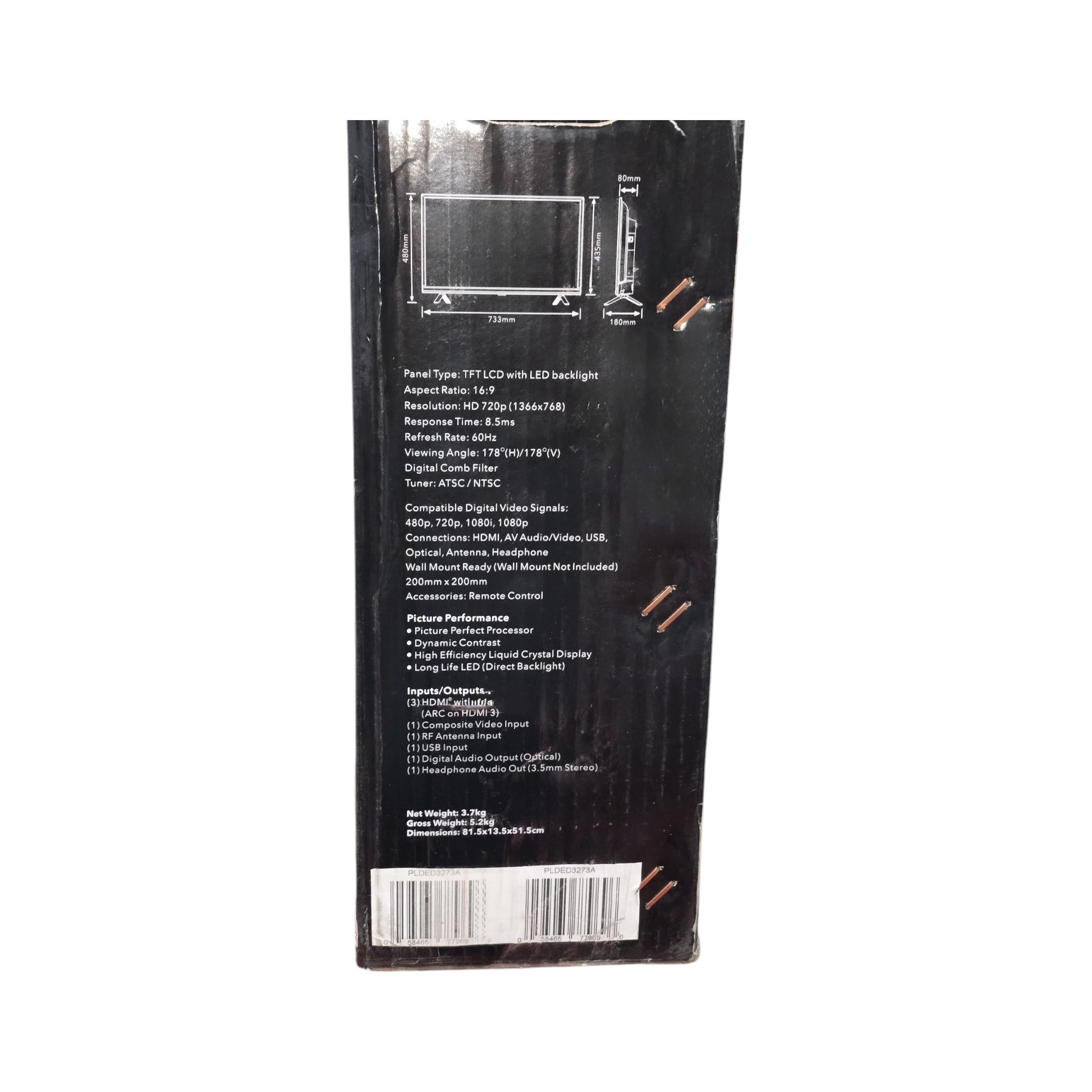 Specifications: PANEL Display Type LED Backlight Life >30,000 Hours Screen Size 32" Native Resolution 1366x768 Aspect Ratio 16:9 Pixel Pitch 0.51mm Response Time 8.5ms Brightness 250 cd/m2 Native Contrast Ratio 1,200:1 Viewing Angles H/V 178 horizontal / 178 vertical viewing angles