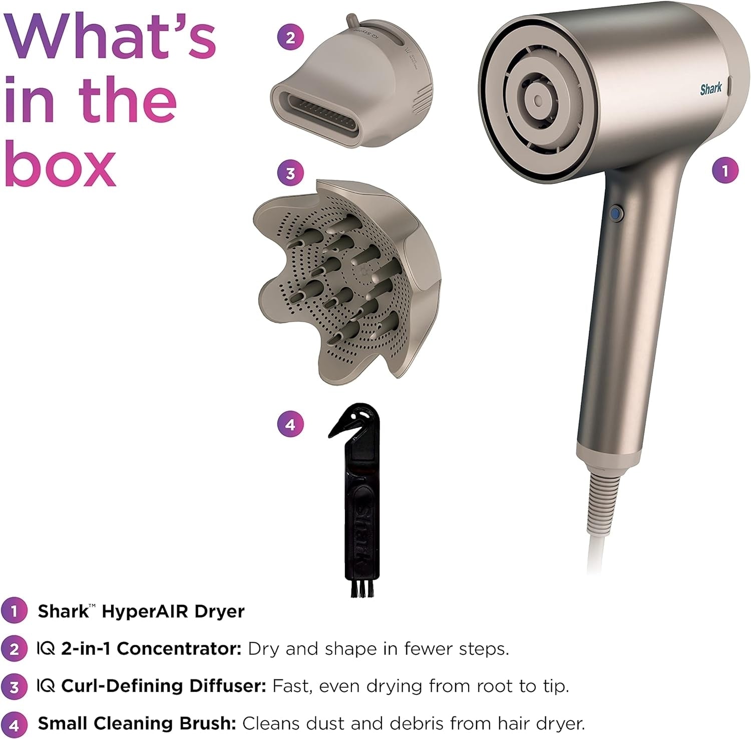 - WHAT'S INCLUDED: Shark HyperAIR Hair Blow Dryer, IQ 2-in-1 Concentrator, IQ Curl-Defining Diffuser & Small Cleaning Brush