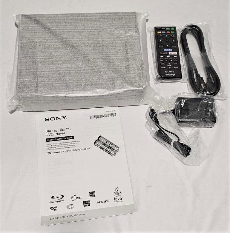 Sony BDP-BX370 Blu-ray Disc Player, Remote control, and HDMI cable.