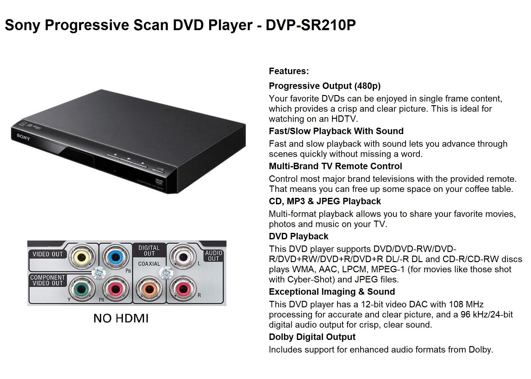 The black Sony DVP-SR210P Progressive Scan DVD Player is a versatile entertainer that comes at an affordable price point. First and foremost, it offers progressive output (480p), so your DVDs will be shown in a single frame and look smoother and clearer than before. This makes it ideal for your HDTV.