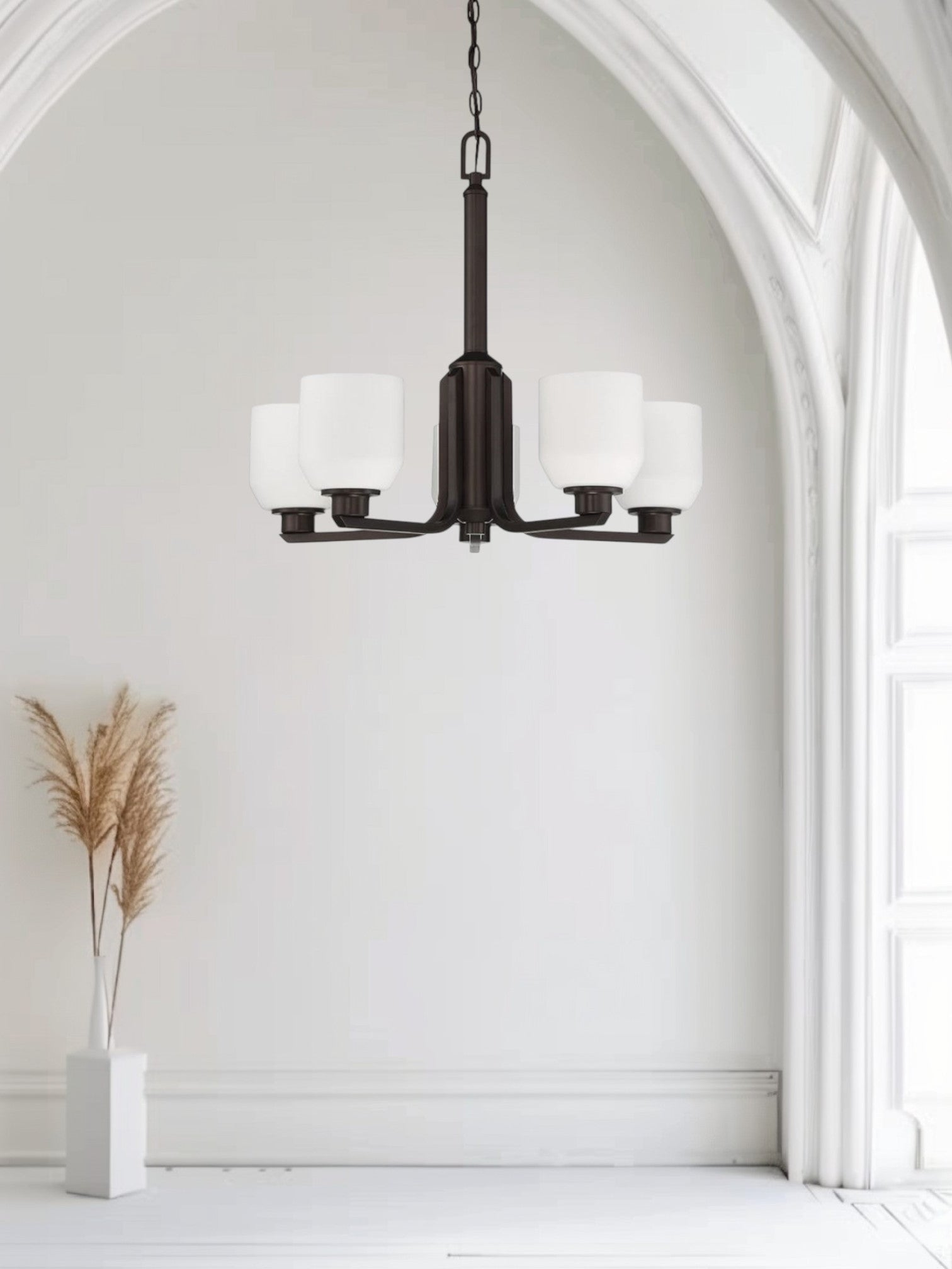 Luminance some five light chandelier will surely give your living space an upgrade complimenting both traditional and modern décor. It is ideal for master bedrooms, entry ways, master baths, dining rooms and kitchens. It accommodates 5 100W light bulbs diffused by rich linen glass shades that creates a soft, warm, inviting glow. Includes 6 ft. Wire and 3 ft. Chain that will allow you to adjust it to fit your ceiling specs.