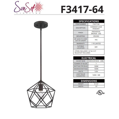 Sunset Lighting F3417-64 One Light Cage Harmony Pendant - Dimmable - with Provincial Bronze Finish Specifications: