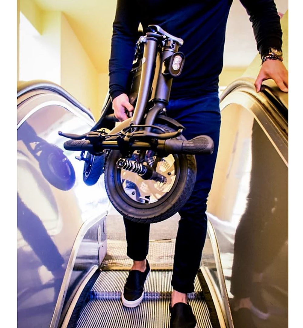 - Robust and foldable, the e-bike's sturdy frame can support up to 264 pounds and collapse its stem and handlebars for easy storage
