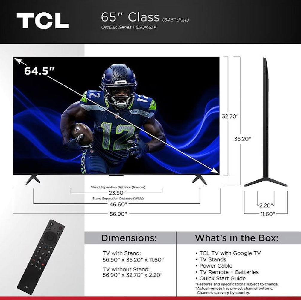 TCL 65" Q Series 4K HDR QD-Mini LED 144Hz AMD Freesync Premium Pro Google Smart TV 65QM63K