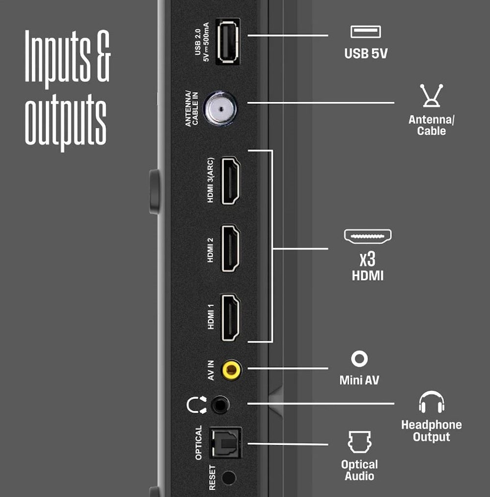 Connectivity is King – A full array of inputs to connect your cable box, game console, streaming stick, sound bar, DVD or Blu-ray player or antenna for local channels. Packed with 4 x HDMI, 1 x Composite Video, 1 x Optical Digital inputs for maximum flexibility.