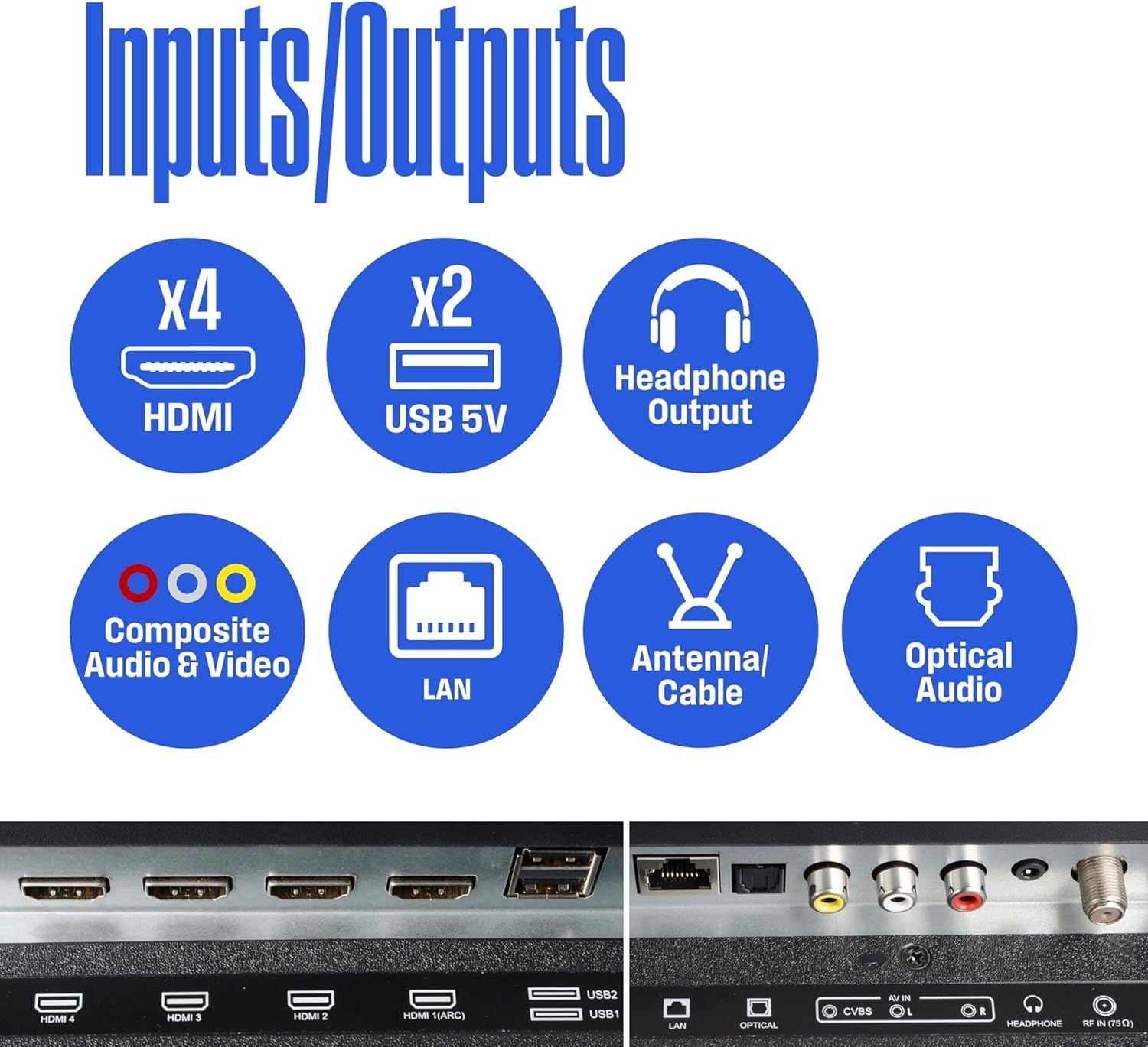 Packed with 4 x HDMI, 1 x Composite Video, 1 x Optical Digital Audio inputs for maximum flexibility. A full array of inputs to connect your cable box, game console, streaming stick, sound bar, DVD/Blu-ray player or a digital antenna for local channels.